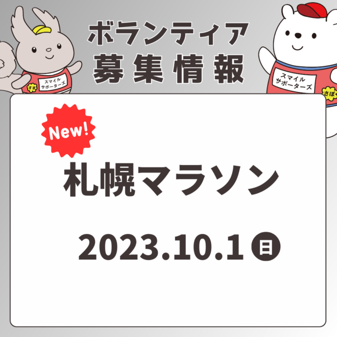 【活動内容詳細と応募について】 ※スマサポ未登録の方は、新規登録をお願いいたします ③「募集中案件」から「第48回札幌マラソン」をご確認ください 【申込締切】 7/31(月) 【札幌マラソン公式HP】 |